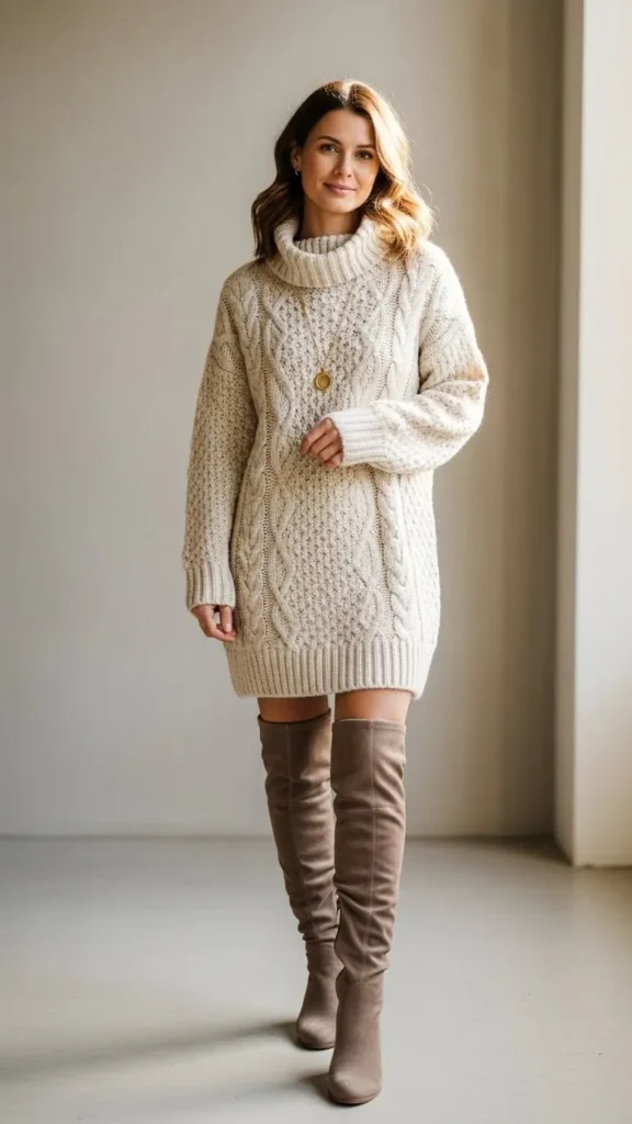 A knit dress provides warmth without sacrificing style. Tall boots complete the look for colder days.