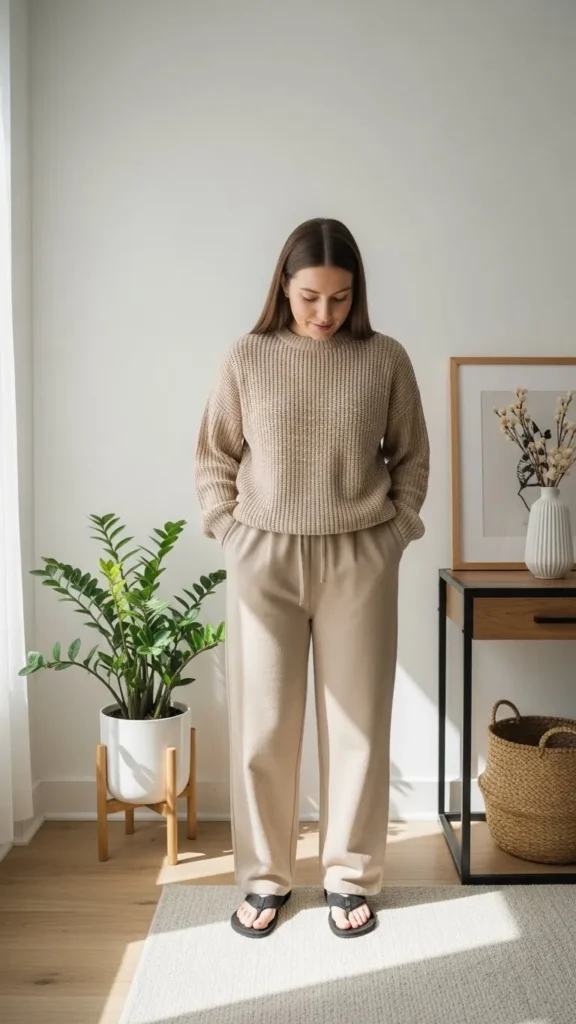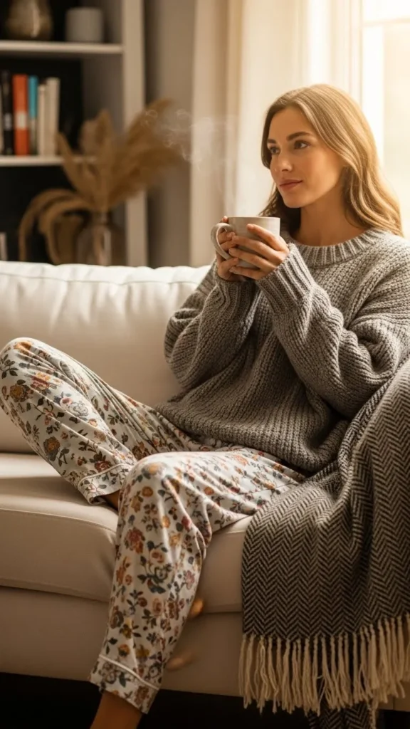 Loose pajama-style pants paired with a chunky sweater feel relaxed yet stylish for home or casual outings.