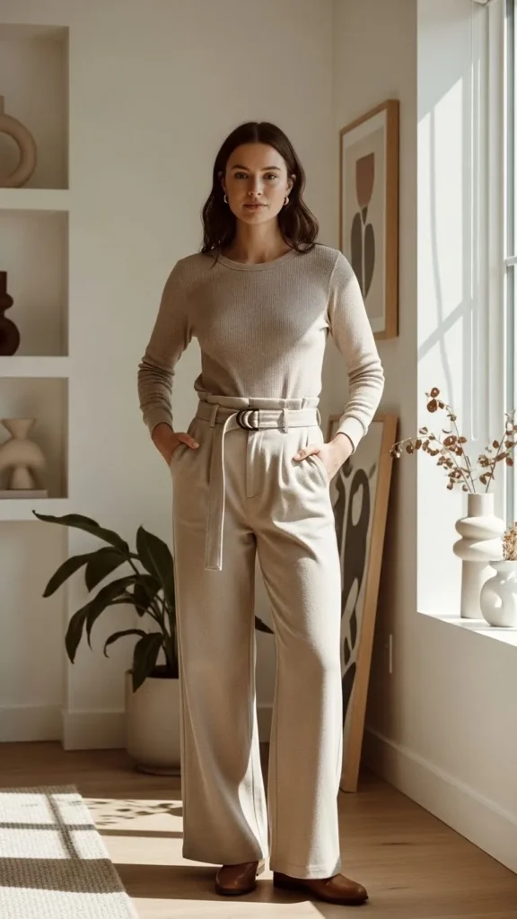 This outfit is cozy yet elevated. A soft turtleneck paired with relaxed trousers works beautifully for casual workdays.