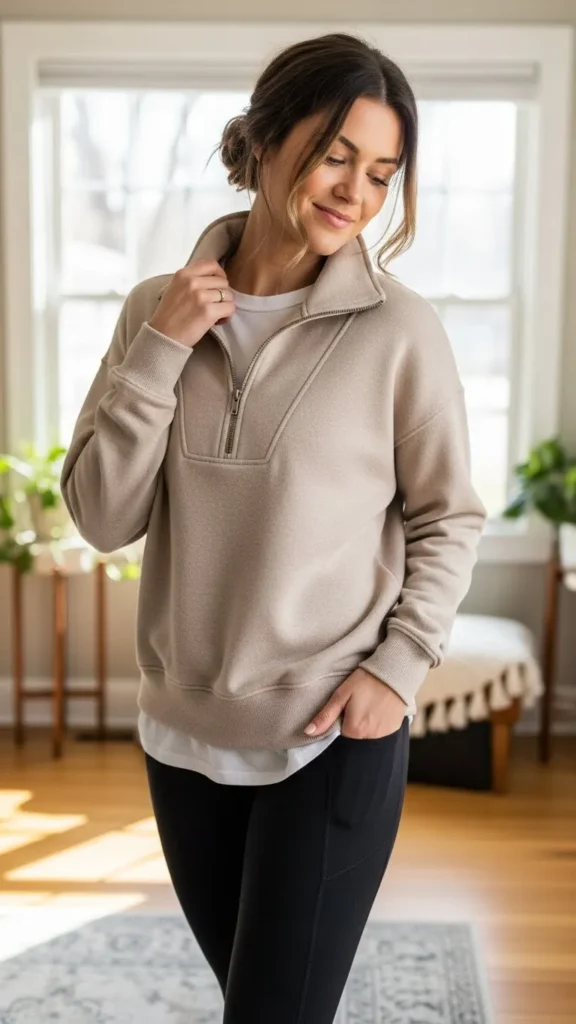 Half-zip pullovers are functional and trendy. This outfit works for errands, walks, or lounging.