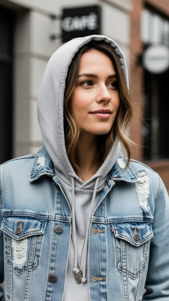 Layering a hoodie under a denim jacket creates warmth without bulk.