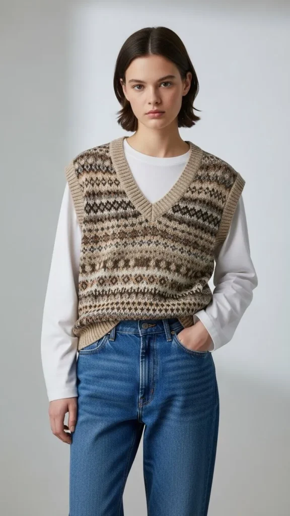 Layering a knit vest adds warmth without bulk. This outfit feels casual yet thoughtfully styled.