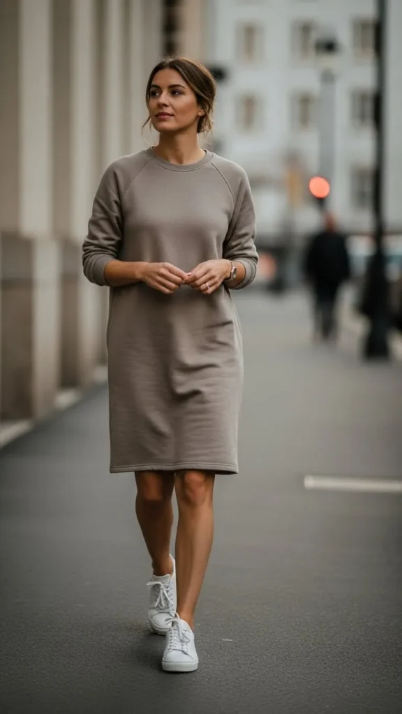 A sweatshirt dress feels like loungewear but looks styled. Pair it with clean sneakers and crew socks for an easy everyday outfit.