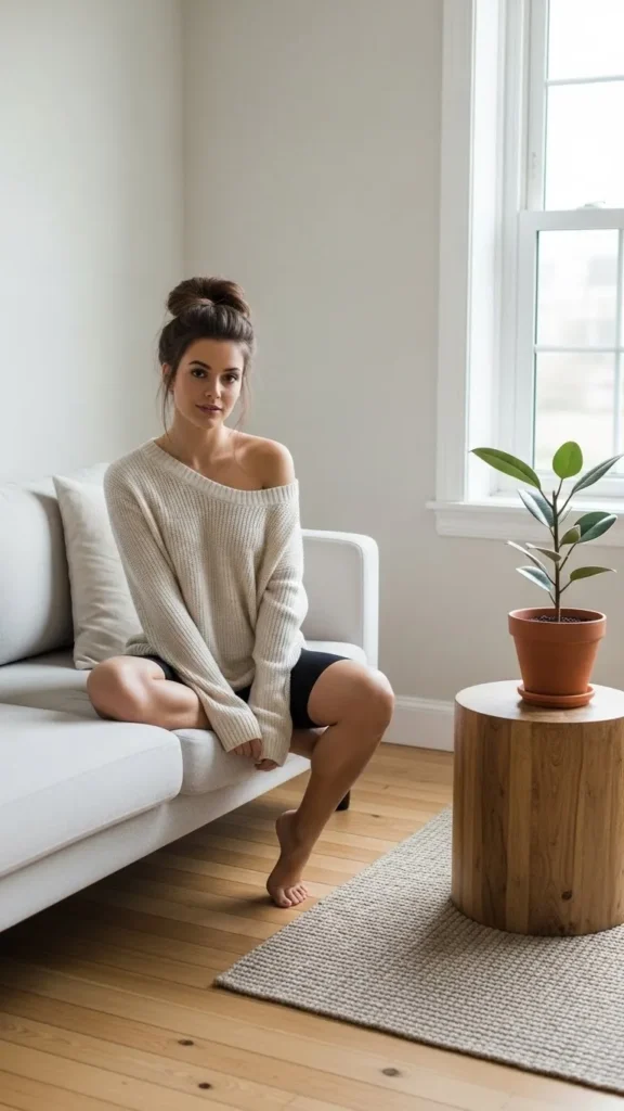 This cozy-casual combo is perfect for mild weather. Oversized sweaters balance biker shorts effortlessly.