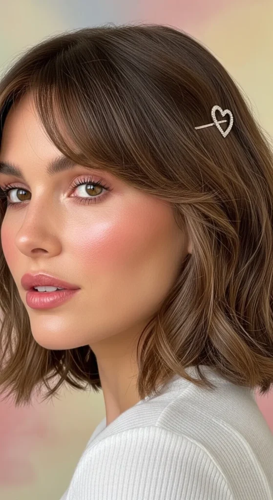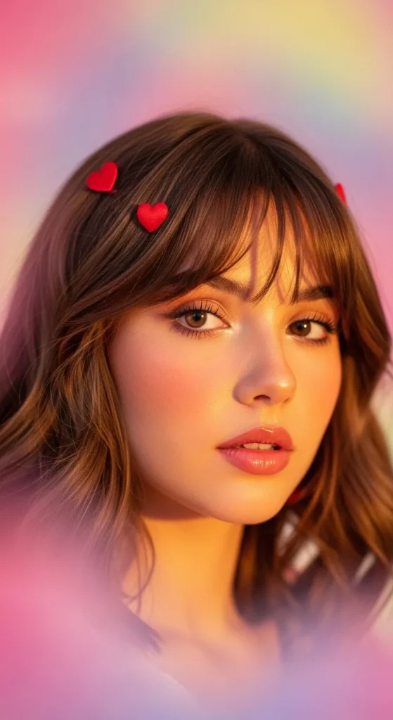 Loose waves create an effortless romantic base, while curtain bangs frame the face softly. Add tiny heart clips near the temples for a subtle Valentine touch that doesn’t feel childish.