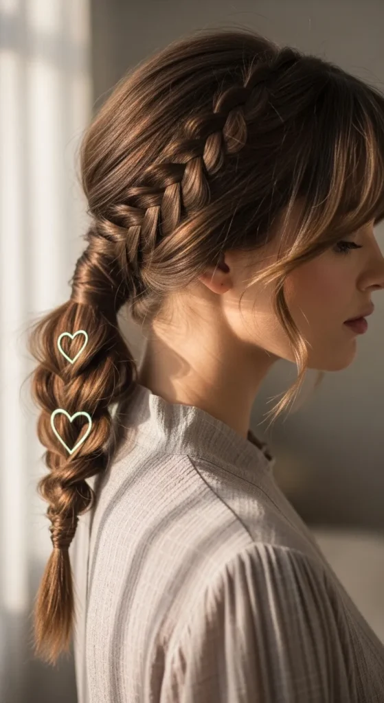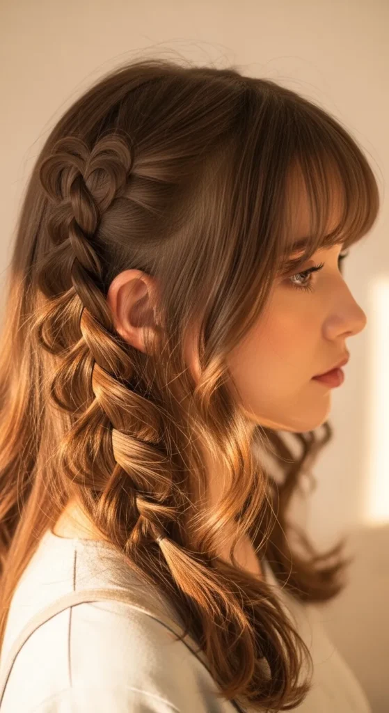 A loose braid with a subtle heart shape near the base keeps the look elegant and unique. Curtain bangs add softness.