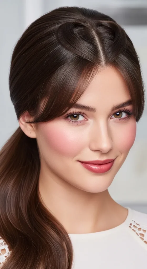 A sleek low ponytail becomes Valentine-ready with a subtle heart-shaped part at the crown. Curtain bangs balance the polished finish beautifully.
