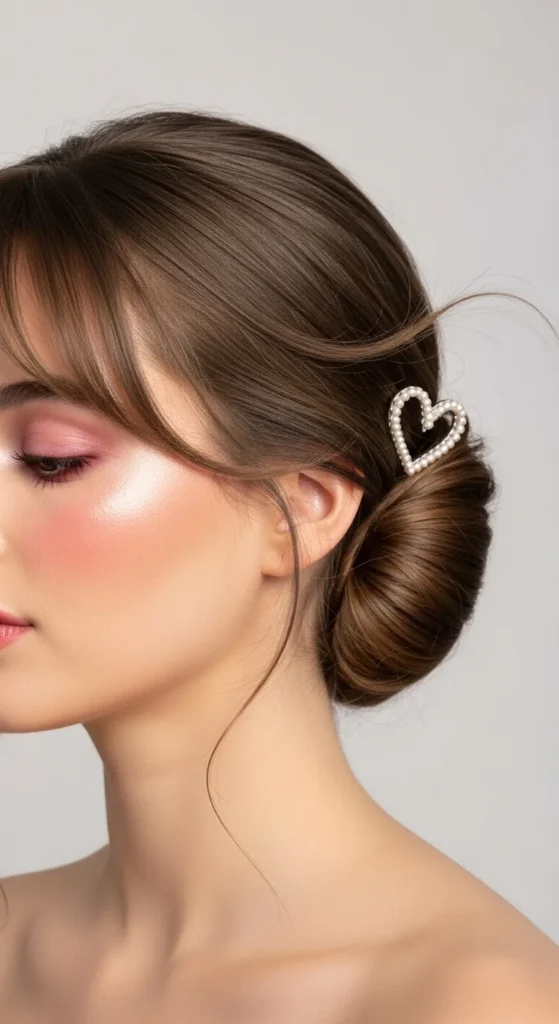 A low romantic updo with a small heart accessory tucked into the back looks elegant and timeless.