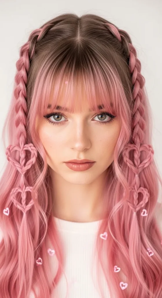 Two small heart-shaped braids near the front give a cute, creative look while curtain bangs keep it wearable and soft.