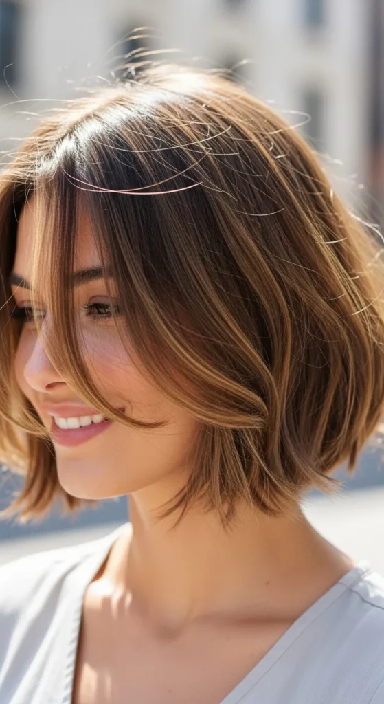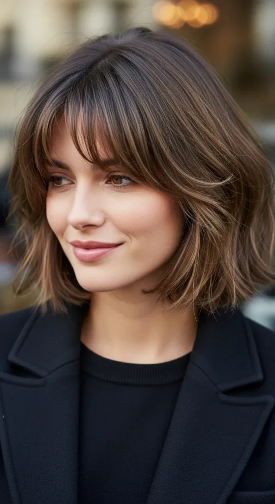 Wispy bangs add instant softness to a short bob haircut. This look frames the face gently and works well for women who want bangs without the commitment of blunt fringe. It’s flattering, youthful, and perfect for everyday wear.