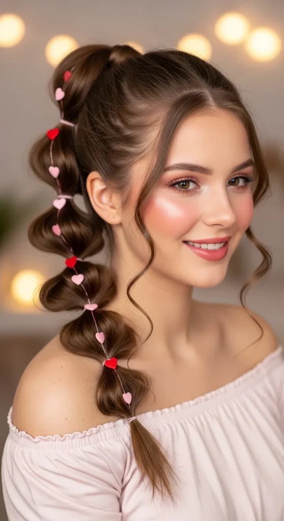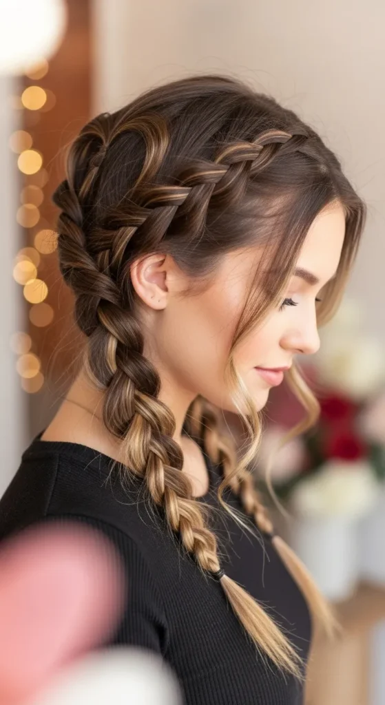 Braided pigtails feel youthful, fun, and trendy. They work especially well for medium-length hair and casual Valentine outfits.