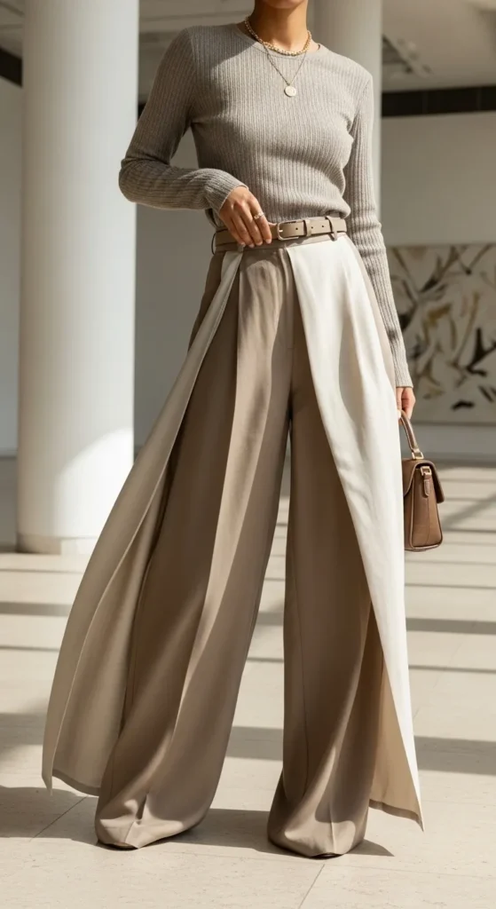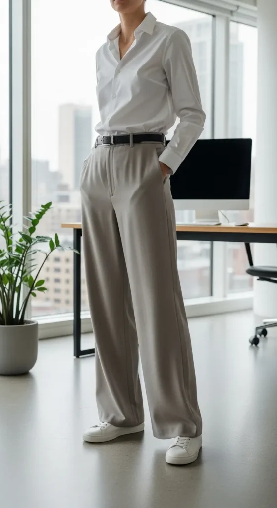 Wide-leg pants paired with loafers create a strong silhouette. This outfit feels modern and flattering when pants skim the floor.