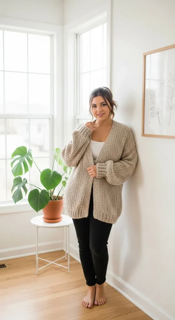 A cropped cardigan keeps the look balanced and feminine. Pair with high-waisted jeans or a skirt for a soft, timeless outfit that photographs beautifully.