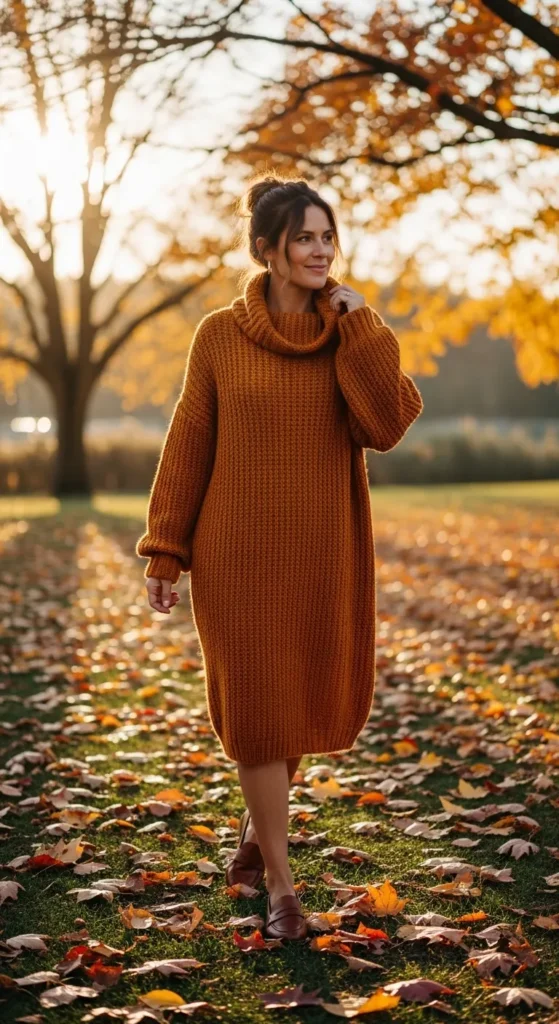 A sweater dress keeps things cozy while chunky loafers add structure. This outfit works well for transitional seasons and looks best in neutral or earthy tones.