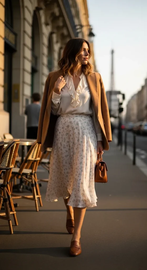 A midi skirt paired with chunky loafers creates a timeless contrast—soft meets structured. This combination works year-round and feels especially chic with pleated or satin skirts and a fitted top.