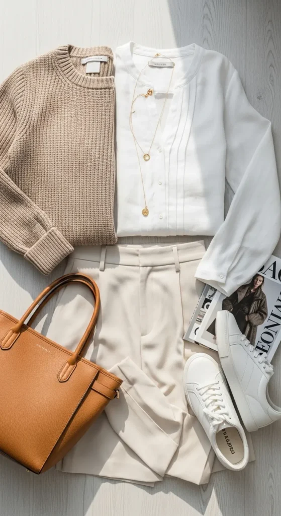 Layering beige, cream, and gray tones creates depth without trend overload. Chunky loafers anchor the outfit beautifully.