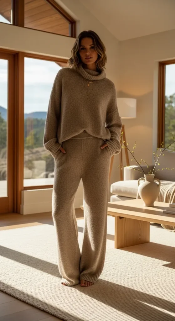 Matching knit sets feel elevated and comfortable. Chunky loafers keep the look grounded and wearable outside the house.