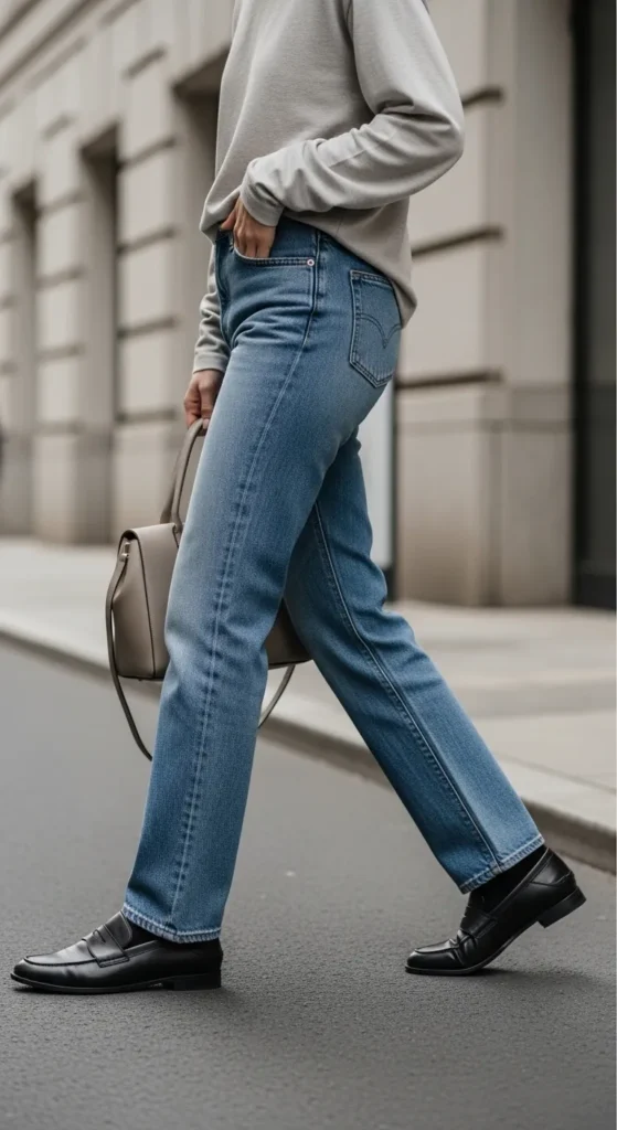 Relaxed or vintage-style denim keeps chunky loafers looking current. Add a tucked tee or structured top to balance proportions.