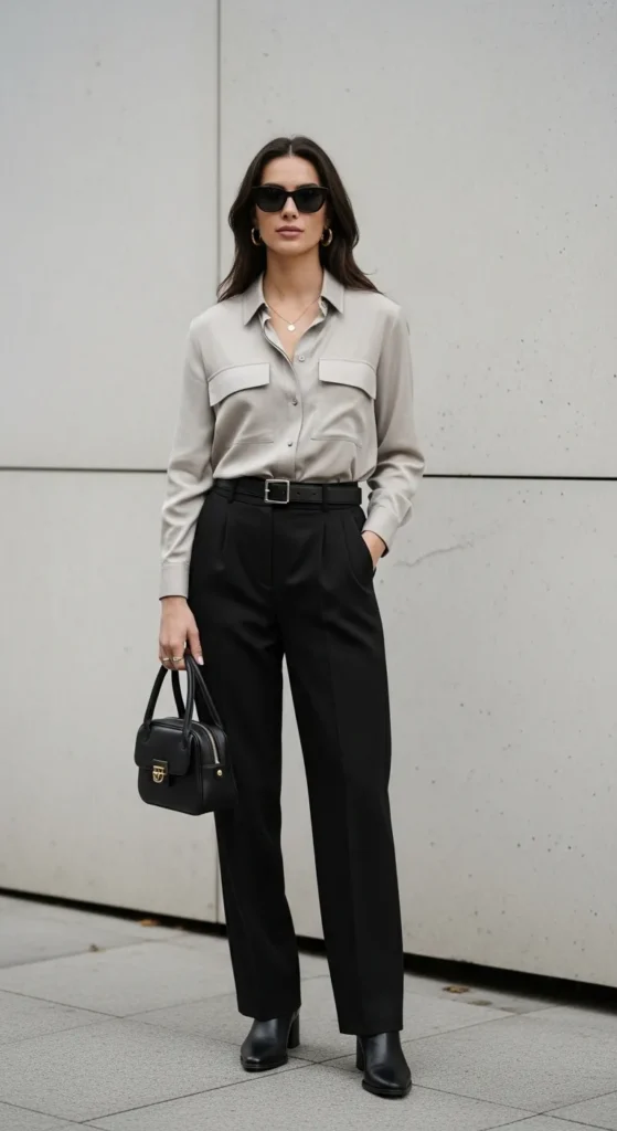 Tailored trousers bring balance to chunky footwear. This outfit feels professional but relaxed, especially when paired with a knit top or crisp button-down.