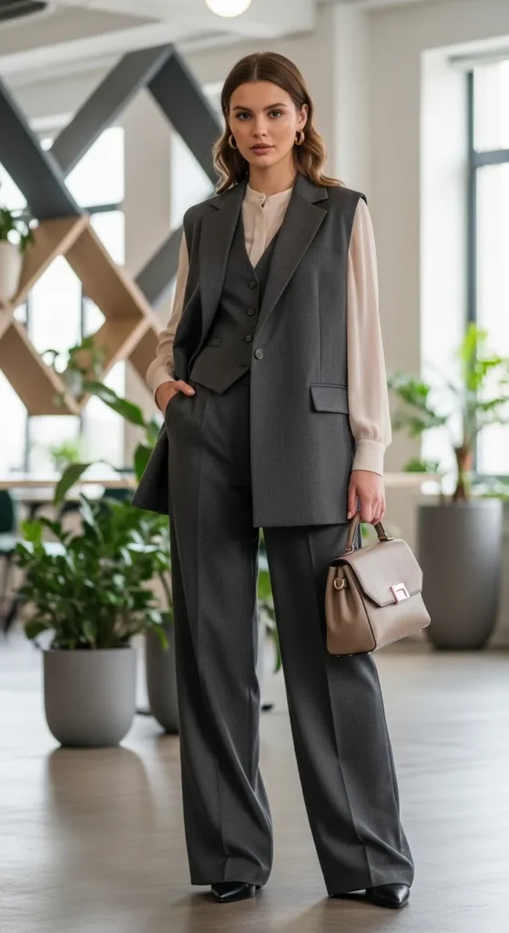 Vest suits are trending in professional fashion. Pair a tailored vest with matching trousers and a lightweight blouse underneath. Add loafers or low heels for a modern executive outfit.
