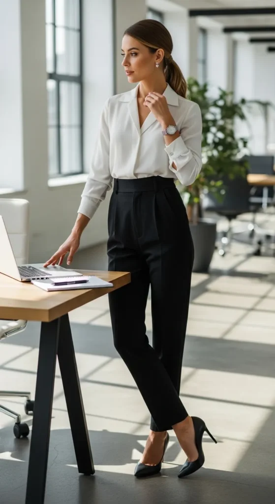 Sometimes simplicity wins. A crisp white blouse with black tailored trousers creates a clean and professional look that recruiters always appreciate. Add a belt, structured bag, and neutral heels to elevate the outfit.