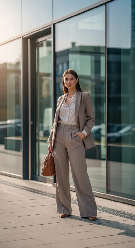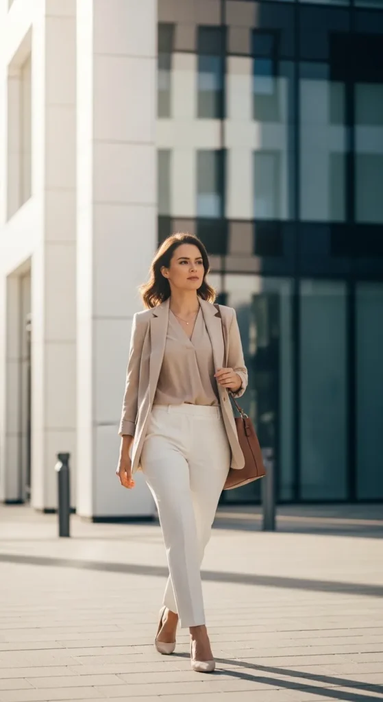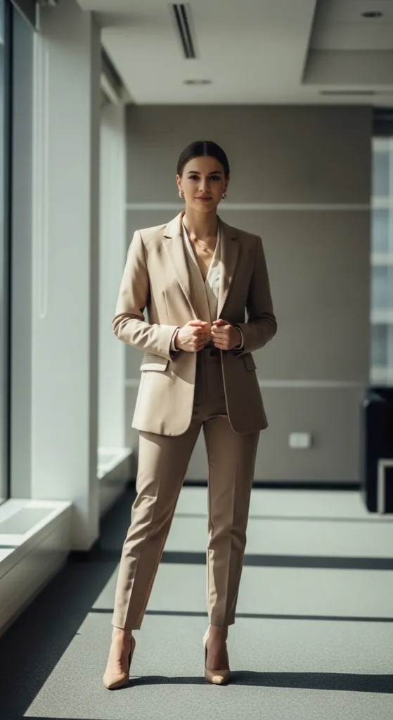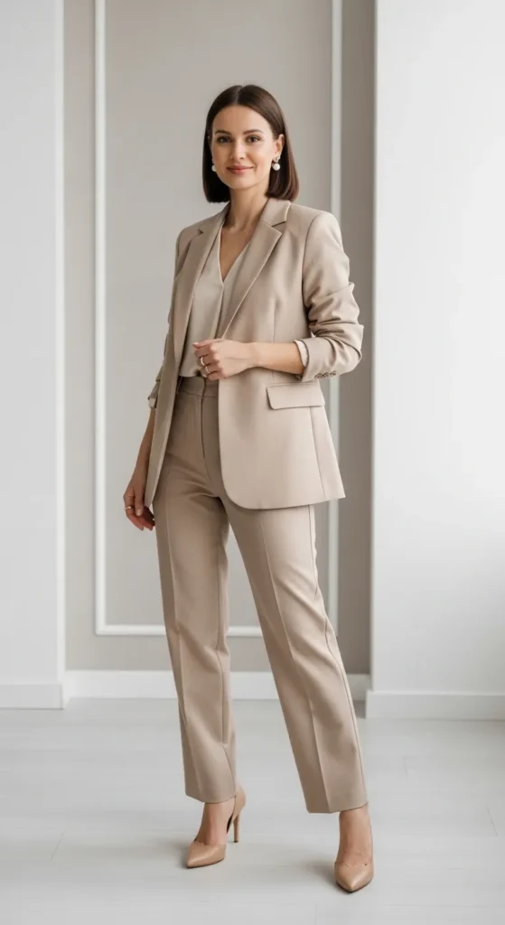 A monochrome beige outfit feels elegant and modern. Combine beige trousers, a beige blazer, and a cream blouse for a coordinated look. Finish with nude heels or loafers. This outfit photographs beautifully for LinkedIn or professional headshots too.