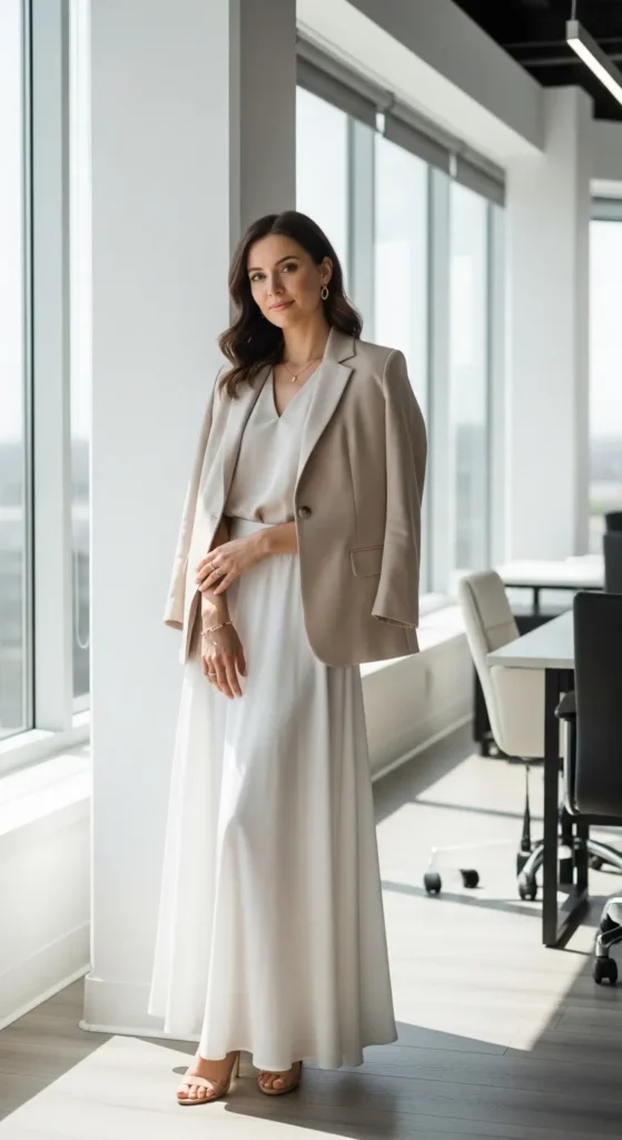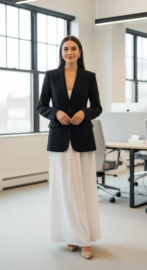 If you want something unique yet professional, try pairing a structured blazer with a flowing white maxi skirt. This creates a stylish contrast that feels elegant but still appropriate for networking events. Keep accessories minimal and choose neutral heels or ballet flats.