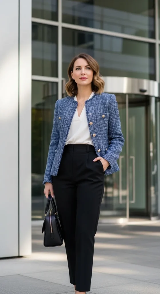 A blue tweed jacket adds subtle texture and personality to a professional outfit. Pair it with black trousers and a tucked-in blouse. This combination looks sophisticated while showing a little style—perfect for industries like media, communications, or fashion.