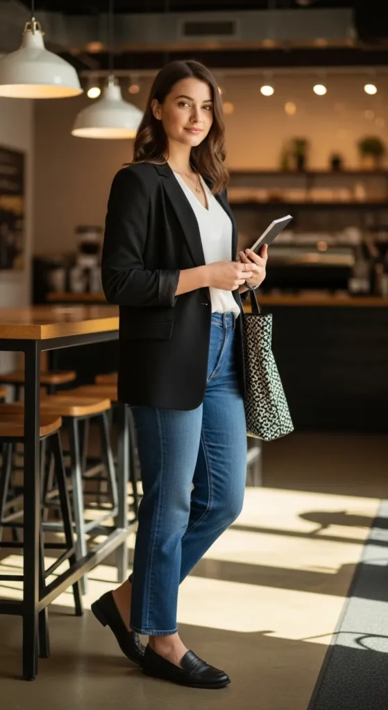 8. Black Blazer with Straight-Leg Jeans (Smart Casual)