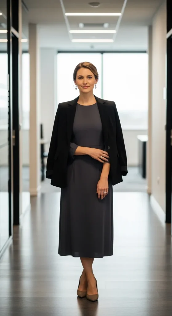 A midi dress with a black blazer is both comfortable and professional. Choose a dress with a simple silhouette and neutral color palette. This outfit allows you to move easily while still looking polished.