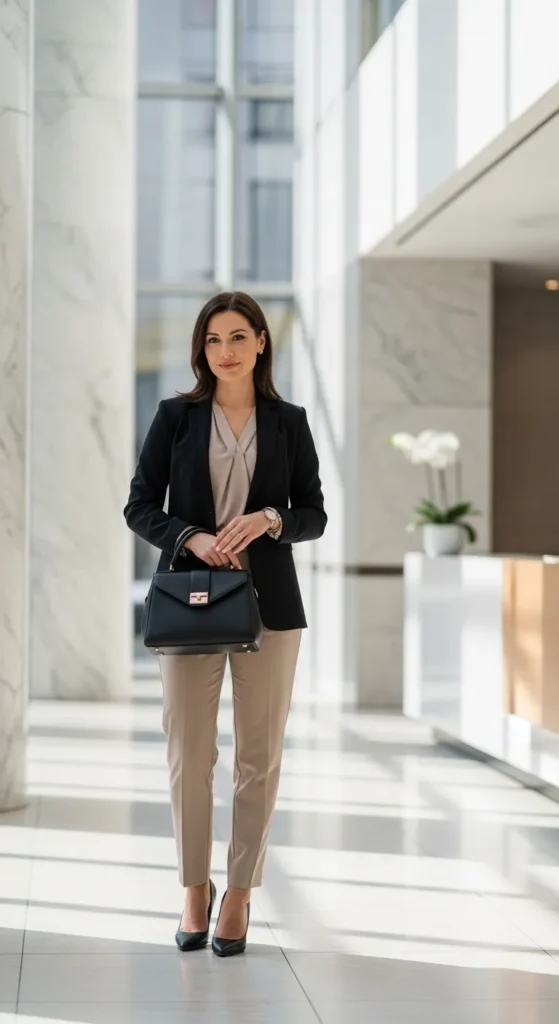 Mixing neutrals creates a balanced professional outfit. A black blazer paired with beige trousers looks polished and modern. Add a soft blouse and pointed flats for a stylish yet practical career fair look.