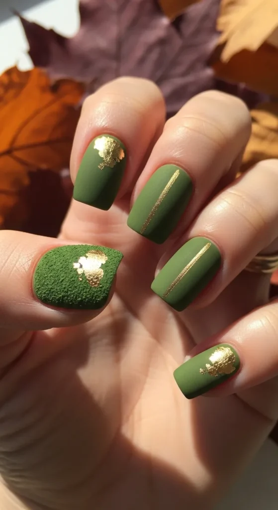 Muted greens like olive and moss bring a grounded, nature-inspired vibe to fall manicures. This shade works well for women who want something different without going bold. Add thin gold lines for subtle nail art color contrast.