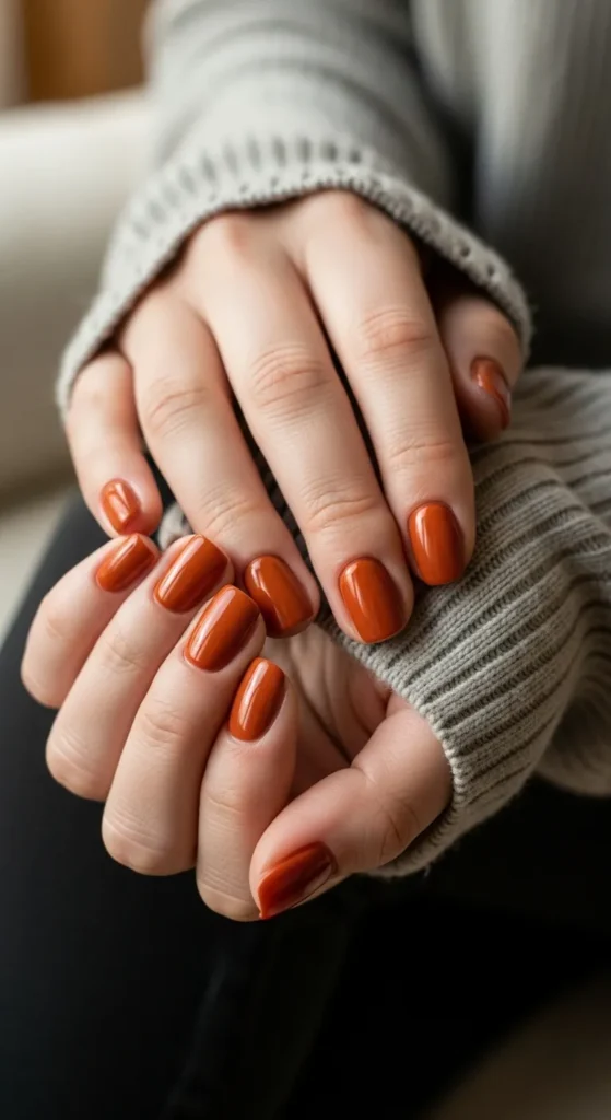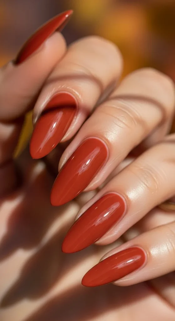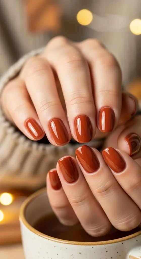 A warm, spiced red feels more fall-appropriate than classic cherry red. It’s bold yet cozy, making it perfect for seasonal transitions and early holiday nail color ideas.