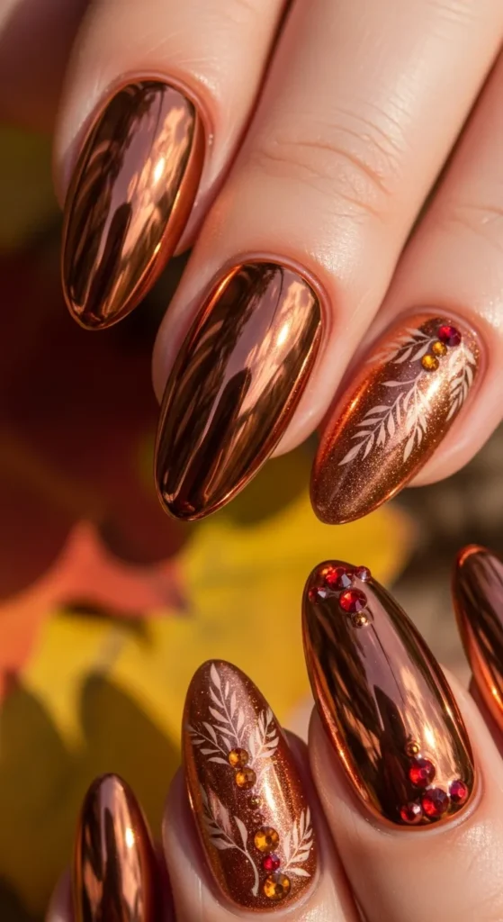 Copper nails bring warmth and shine to fall manicures. This shade works especially well for holidays, events, or statement looks without heavy nail art.