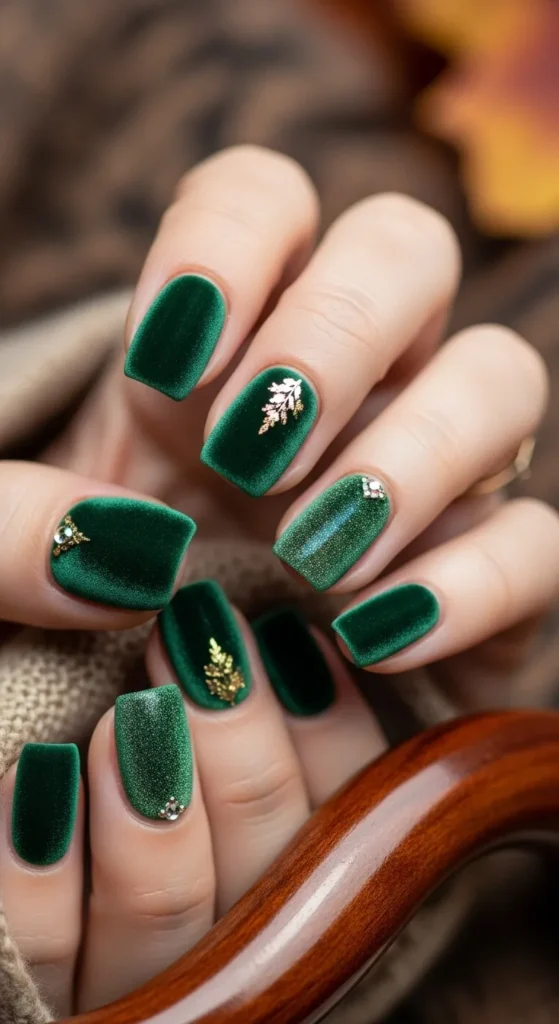 Velvet-inspired green nails add texture and depth without nail art overload. This color feels luxurious and pairs beautifully with gold jewelry and warm fall outfits.