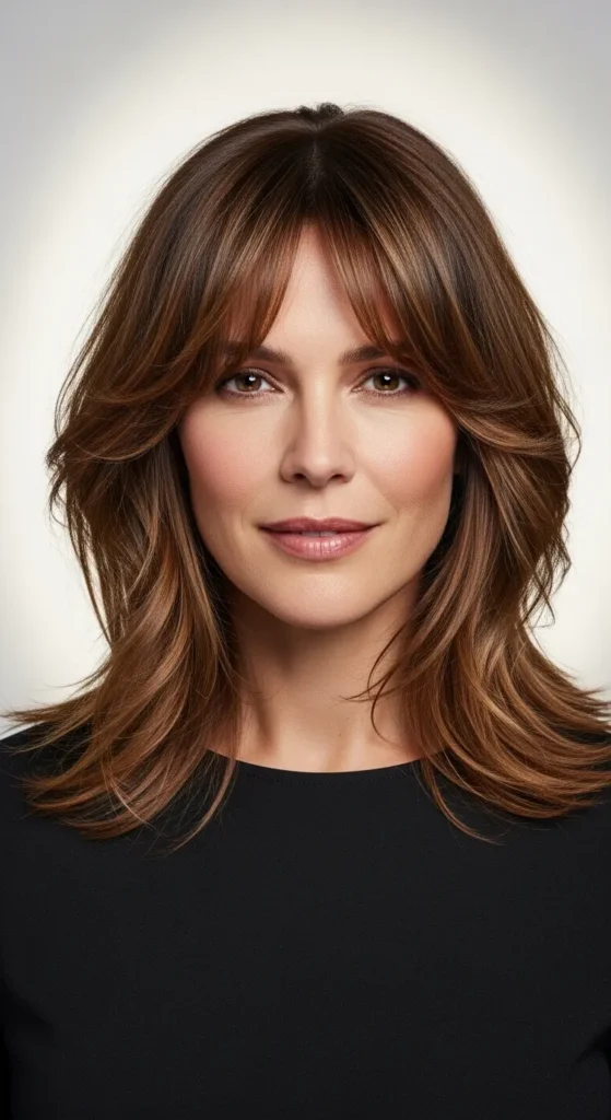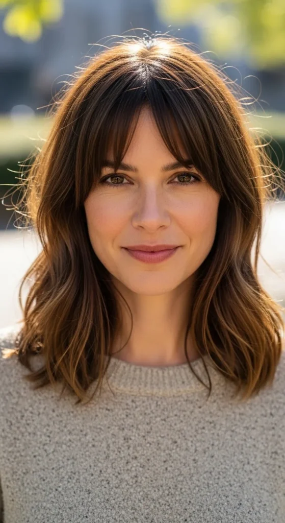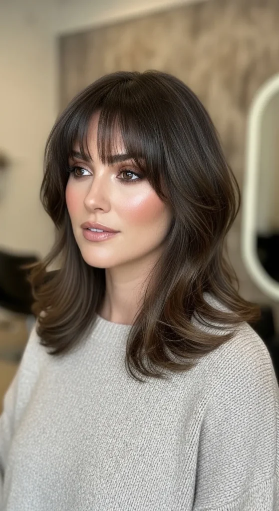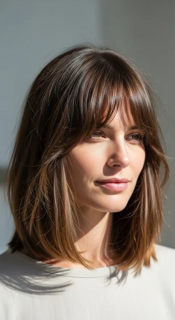 Long curtain bangs paired with a medium cut offer flexibility and softness.