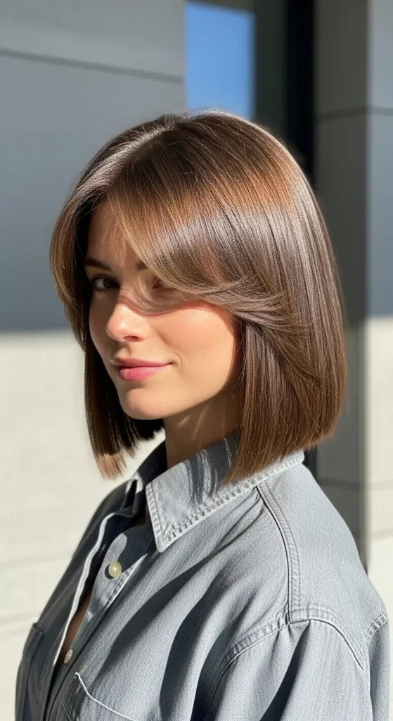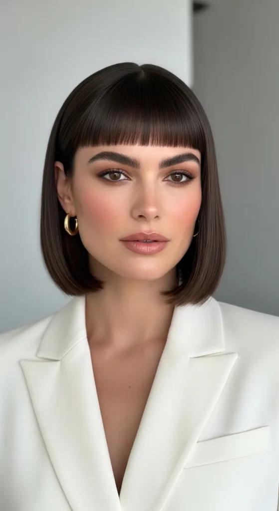 Medium-length hair hits the sweet spot: long enough to feel feminine, short enough to stay manageable. Add bangs, and you instantly get structure, face-framing, and style—without extra effort.