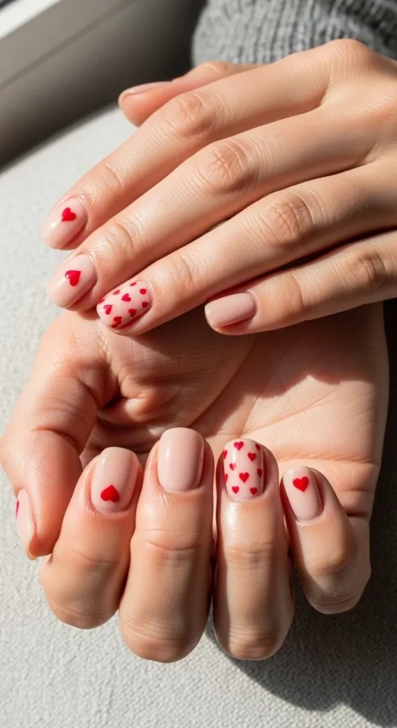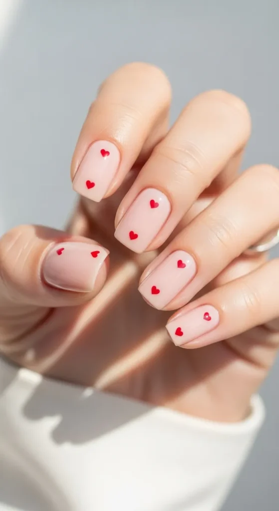 Tiny hearts placed delicately across a pink or nude base feel modern and chic. This is one of the easiest Valentine’s Day nails to recreate at home and performs extremely well on Pinterest.