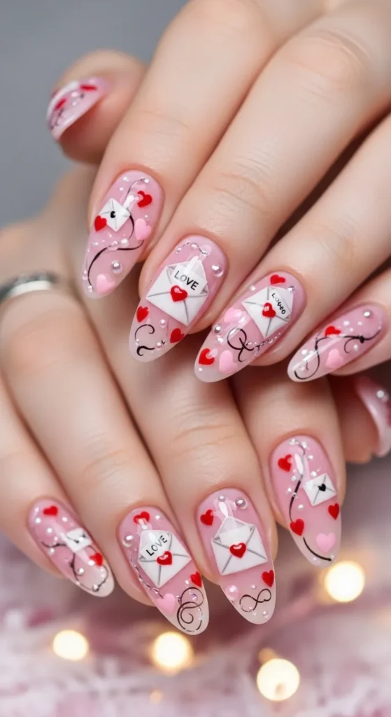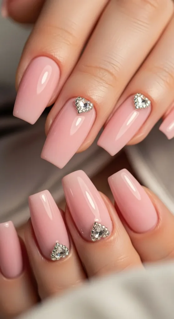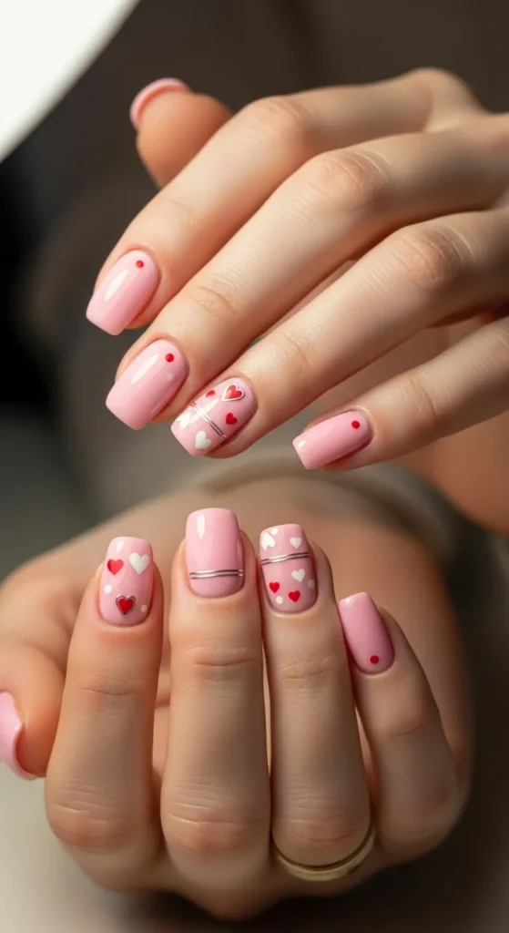 Soft pink nails with delicate Valentine details feel elegant and universally flattering. This style is popular across global Pinterest searches.