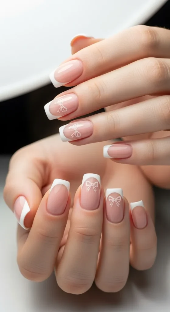 6. Minimal French Tips with Tiny Bow Detail