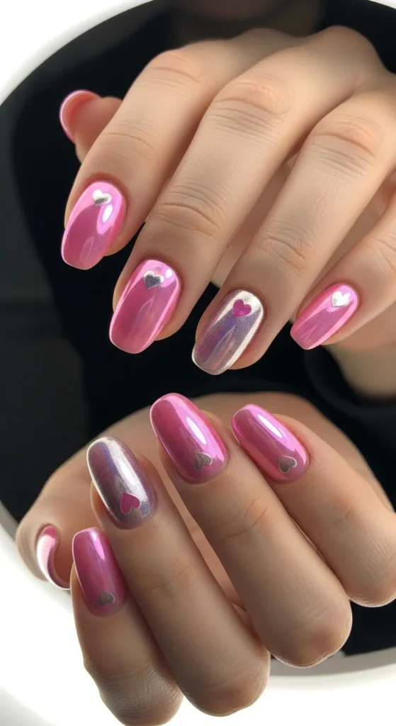 Pink chrome nails add a modern, reflective glow while still feeling romantic. Add subtle heart accents to keep it Valentine-ready.