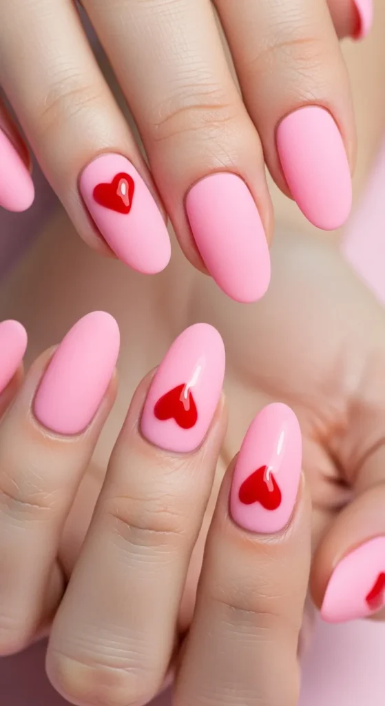 19. Matte Pink Valentine Nails with Glossy Hearts