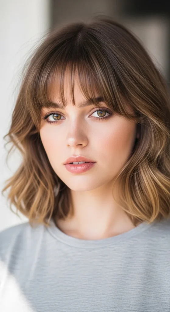 Curtain bangs and waves are a match made in Pinterest heaven. They blend seamlessly into layered cuts and frame the face without constant trims. Best styled with a round brush or soft wave near the front.