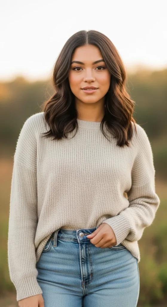Styling tip: Loose curls or soft blowouts enhance the warmth.