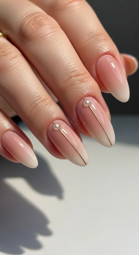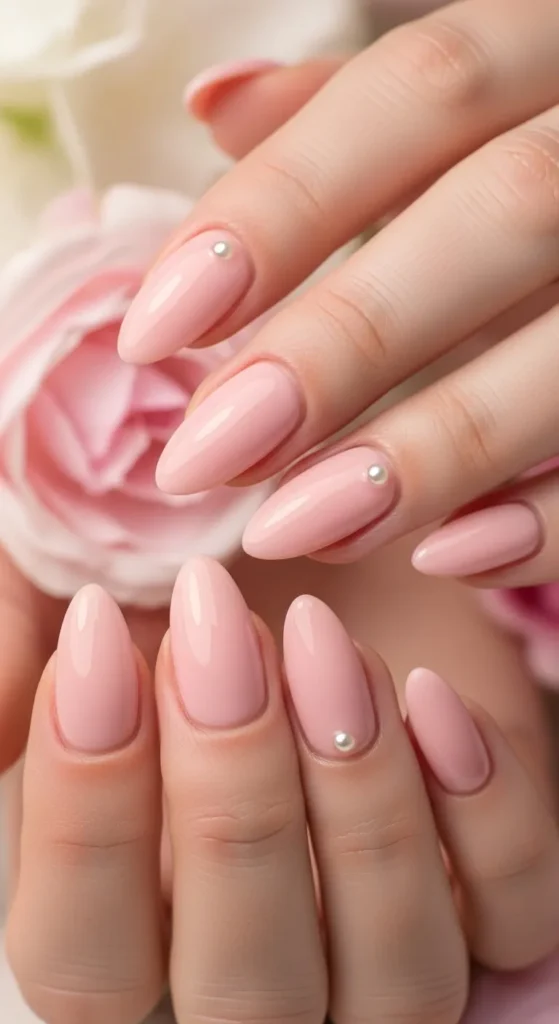 Soft blush pink nails paired with a tiny pearl on one accent nail feel feminine and elegant. Keep the pearl small for a refined finish. This design works beautifully for spring events and special occasions.