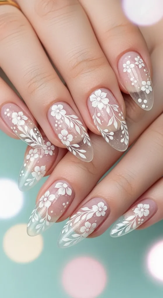 Clear or jelly nails with delicate floral art feel fresh and airy. Choose soft white or pastel florals to keep the design elegant. This style is perfect if you want something seasonal without committing to bold color.