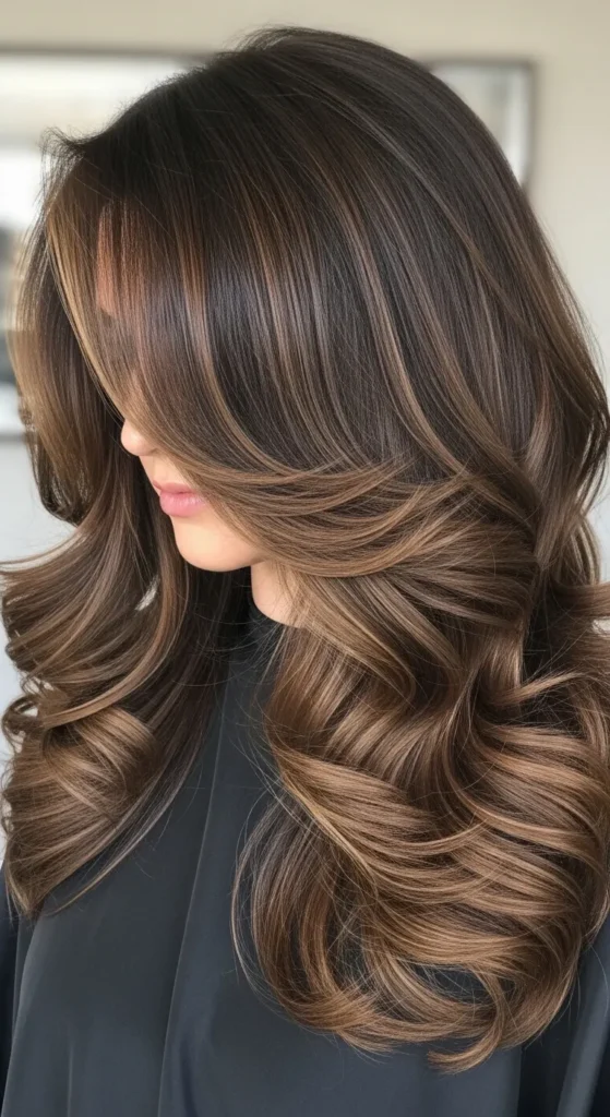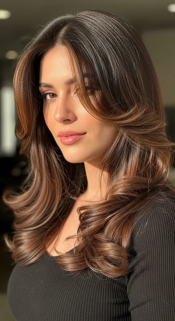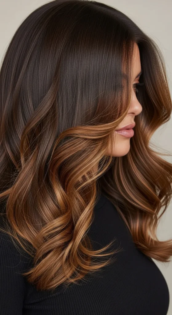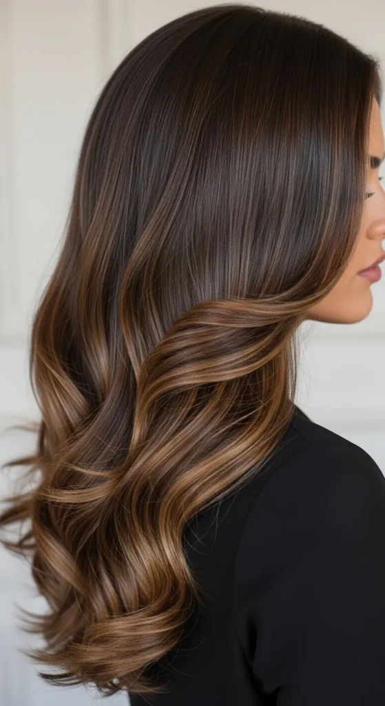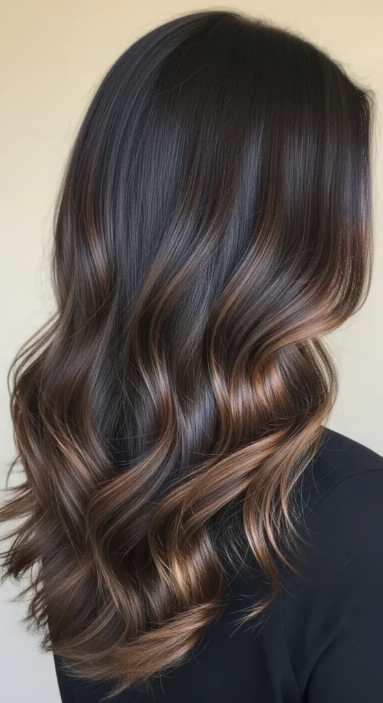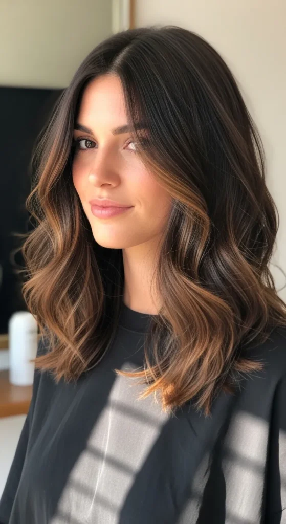 Dark espresso hair paired with soft brown balayage creates a luxurious multi-tone effect. The highlights catch light beautifully, especially in waves or curls. This style works perfectly for medium to long hair and adds richness without making the color look too bright.