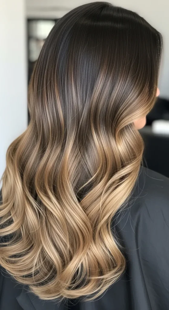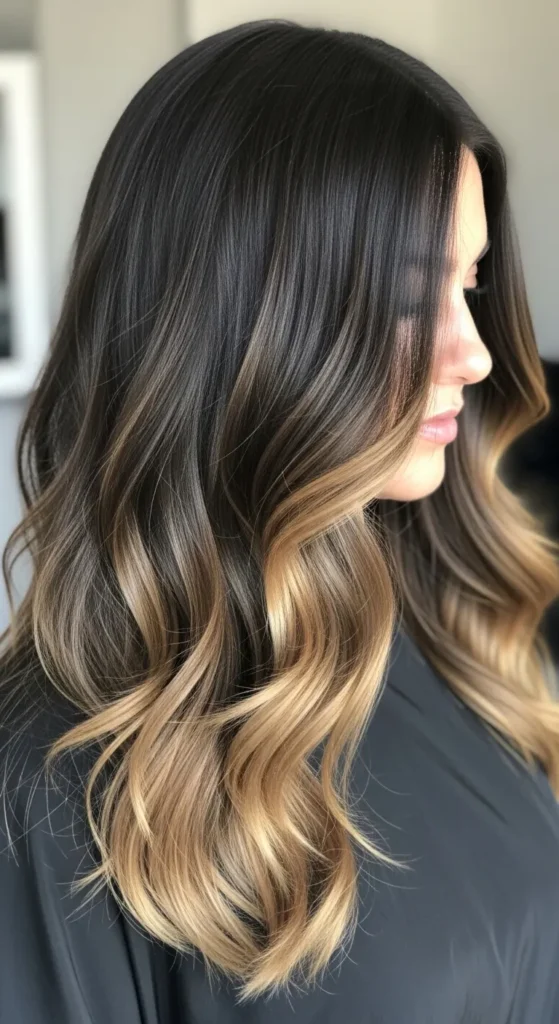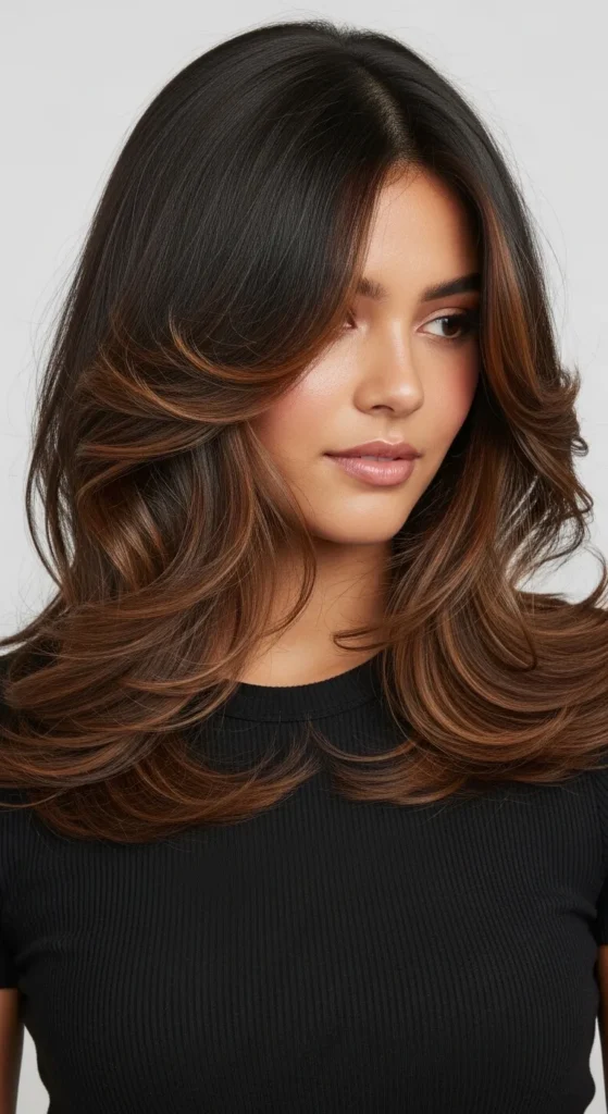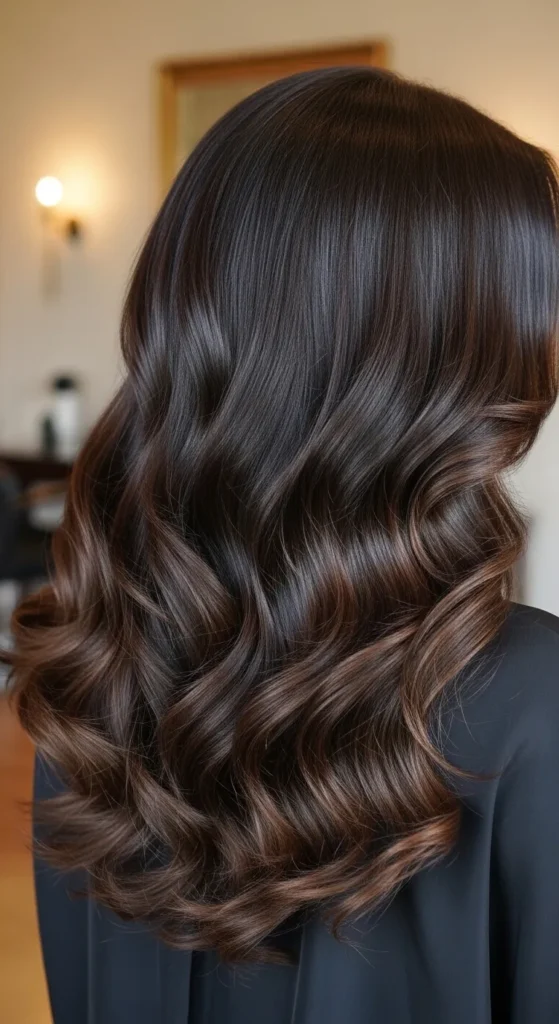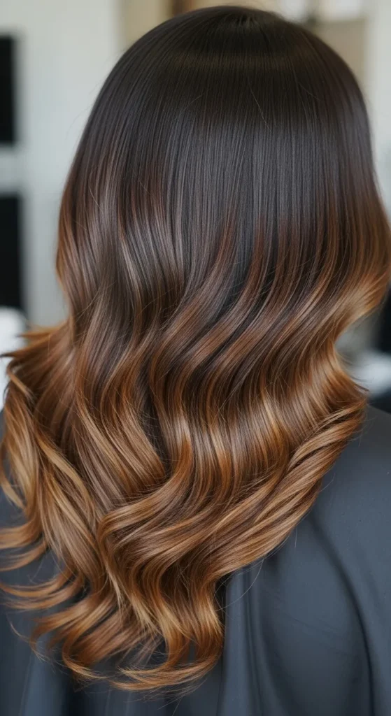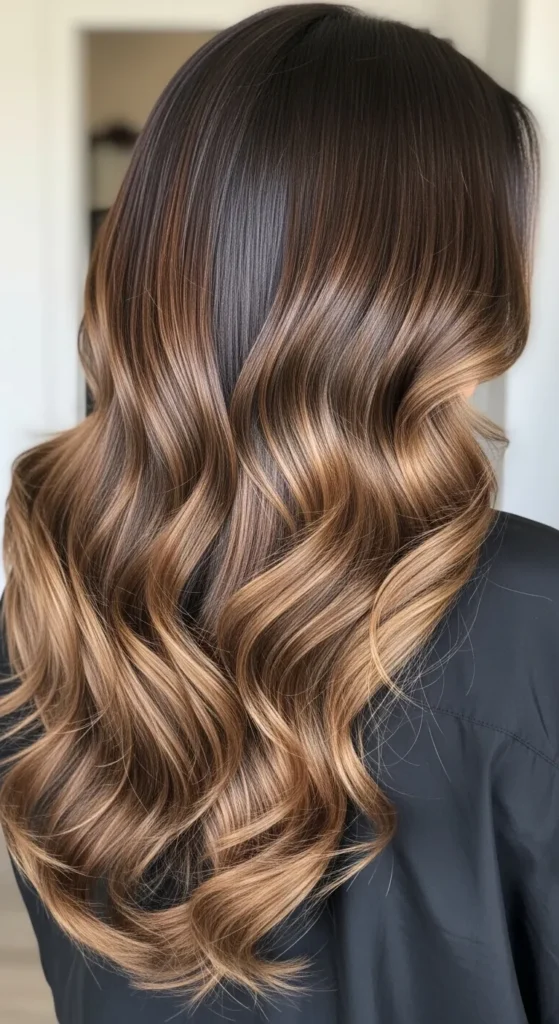 Dark espresso hair paired with soft brown balayage creates a luxurious multi-tone effect. The highlights catch light beautifully, especially in waves or curls. This style works perfectly for medium to long hair and adds richness without making the color look too bright.