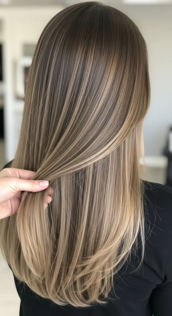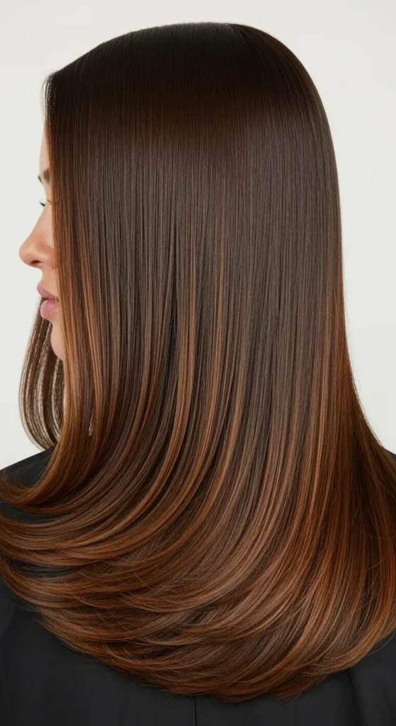 Straight hair showcases color blending beautifully. Soft brown balayage adds visible contrast while keeping the overall look sleek and polished. This style works great with blunt cuts or long straight hairstyles.