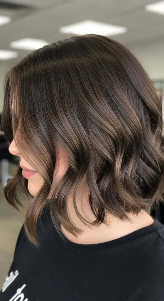 Loose waves help balayage highlights stand out. Dark chocolate tones blended through brunette hair create a glossy, luxurious finish. This look is often seen in Pinterest-worthy hairstyles because it photographs beautifully in natural light.